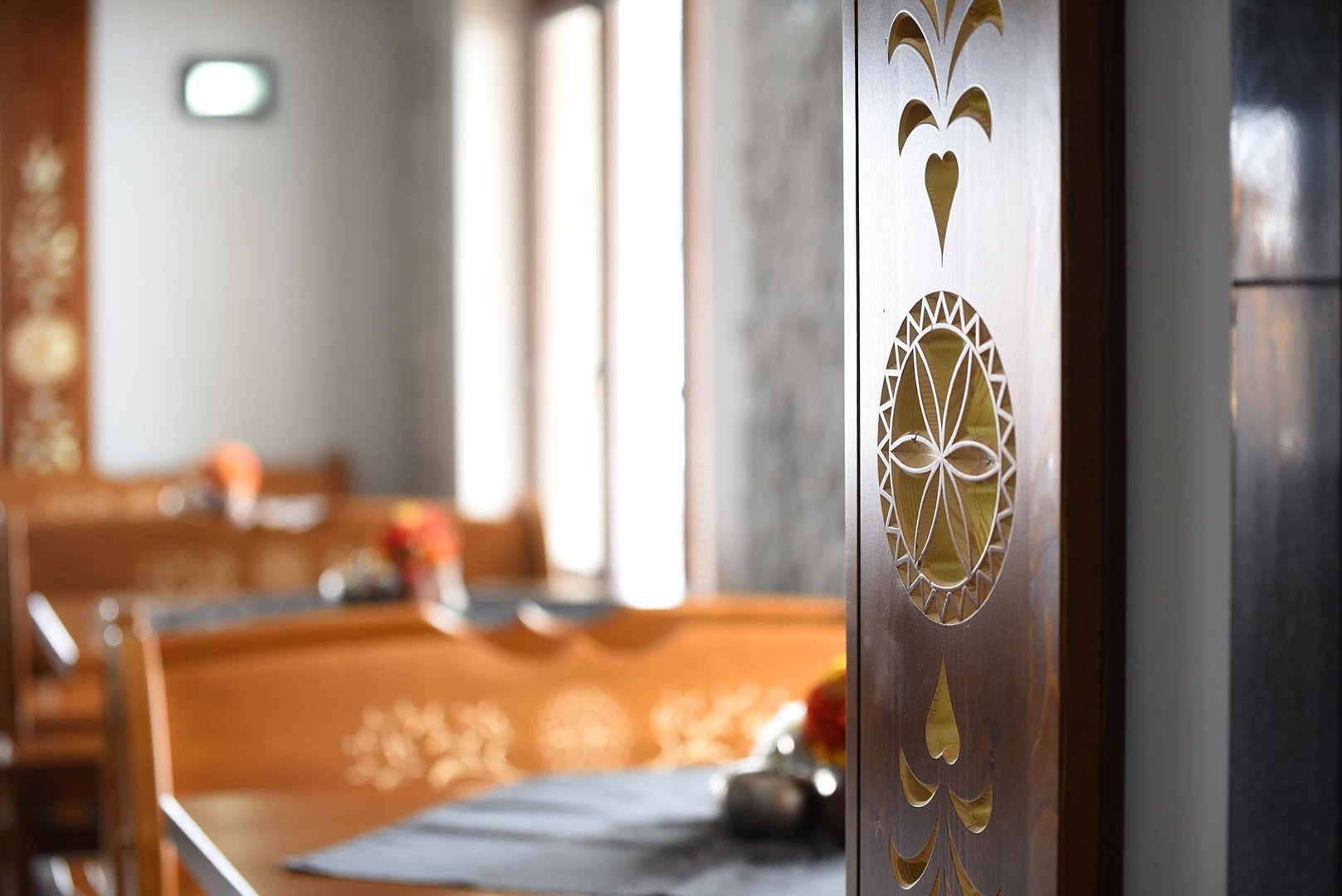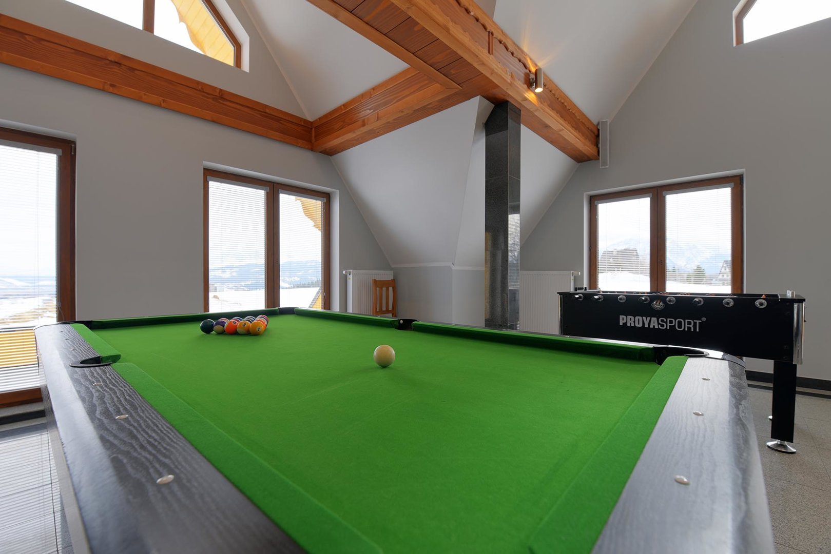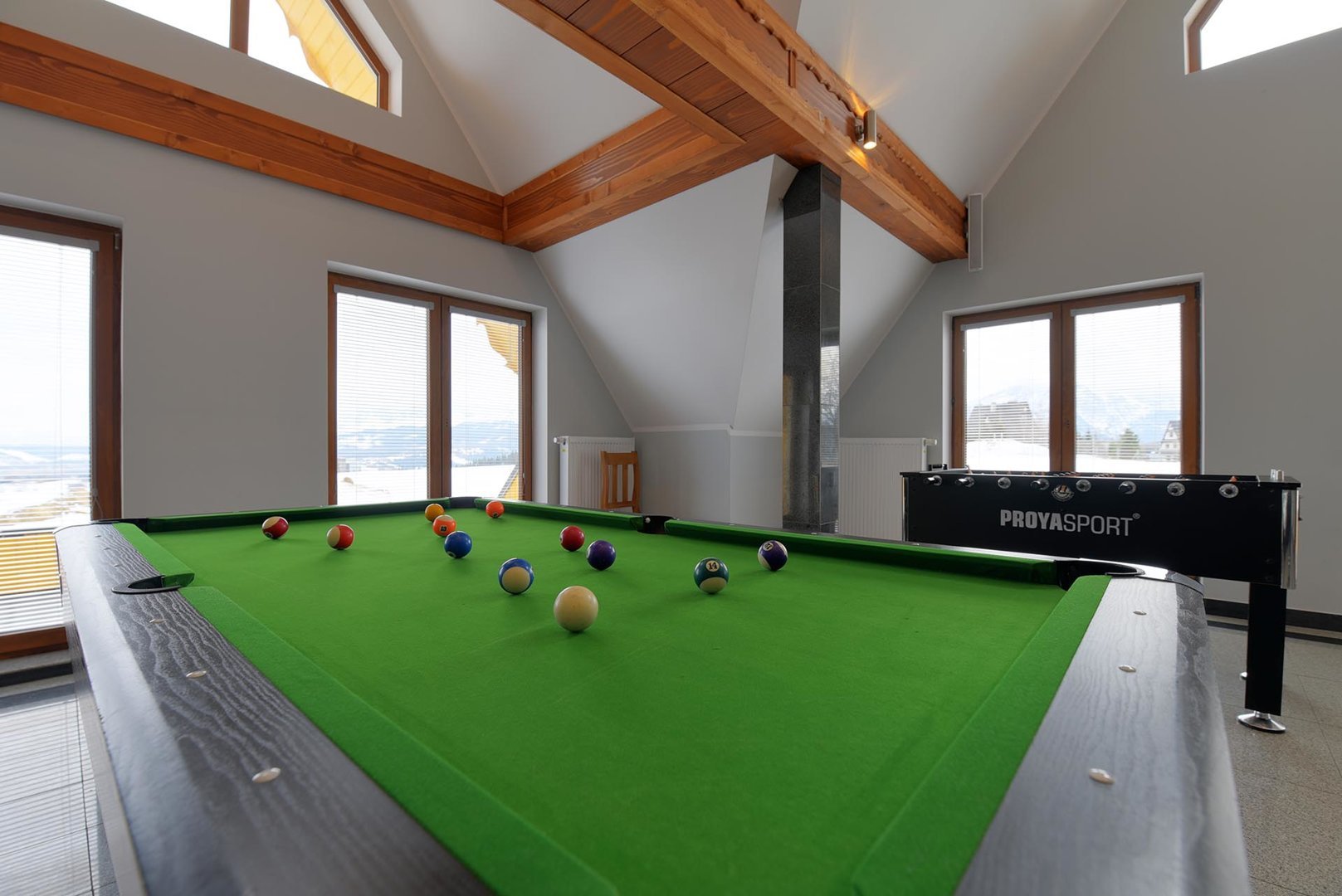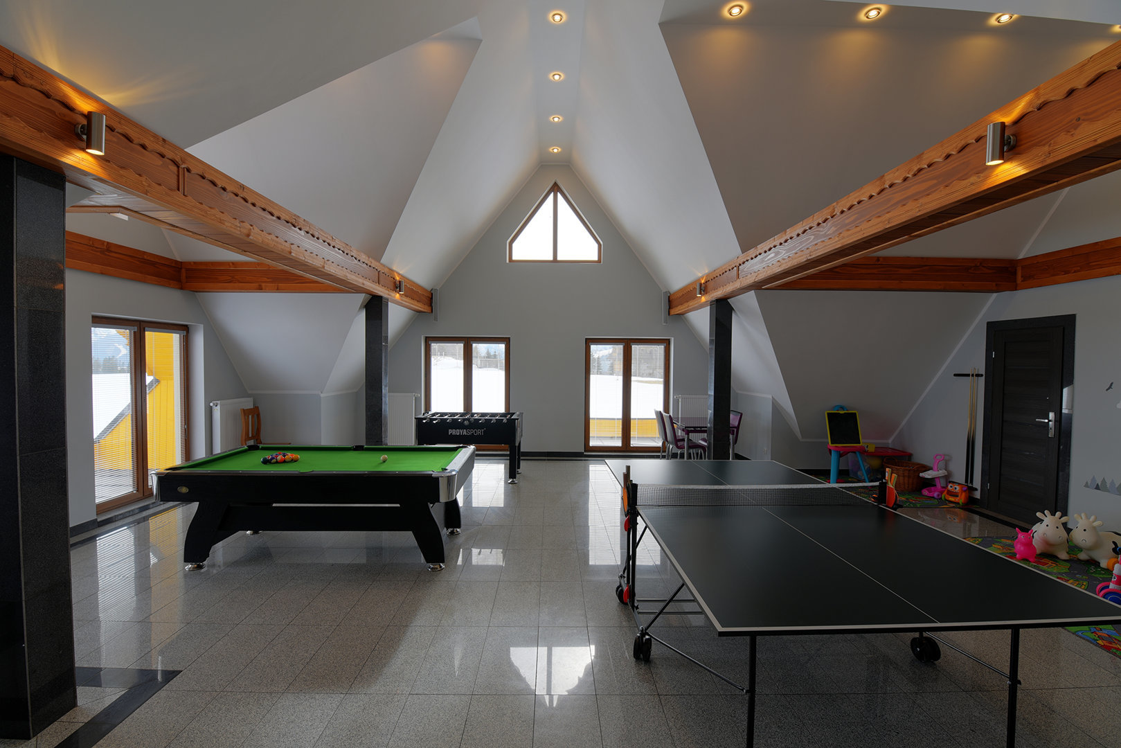 kavereiden kanssa. Iltaisin voit istua kahden hengen pöydän ääressä ja ihailla panoraamaikkunaa, jonka koko on 5x3 metriä. 6 metriä korkea, kolmion muotoinen huone, joka on sisustettu puulla ja tyylitelty