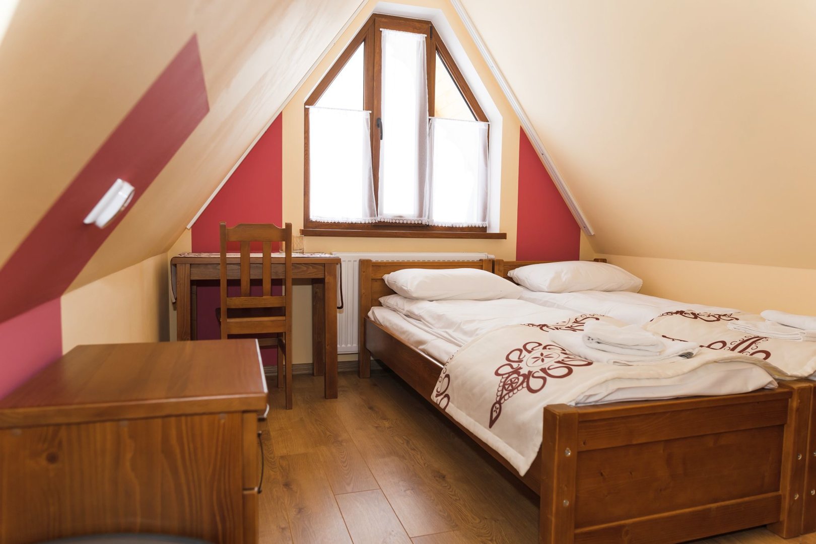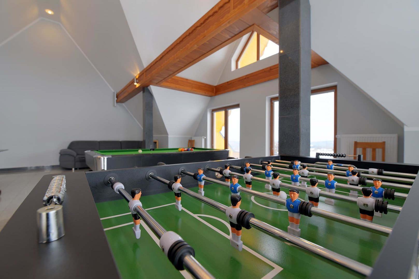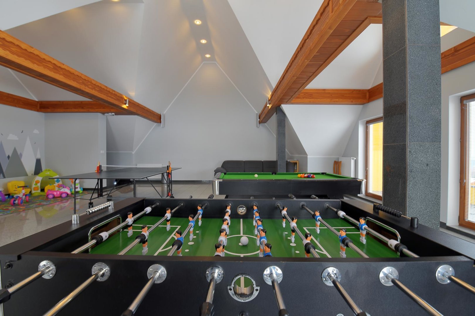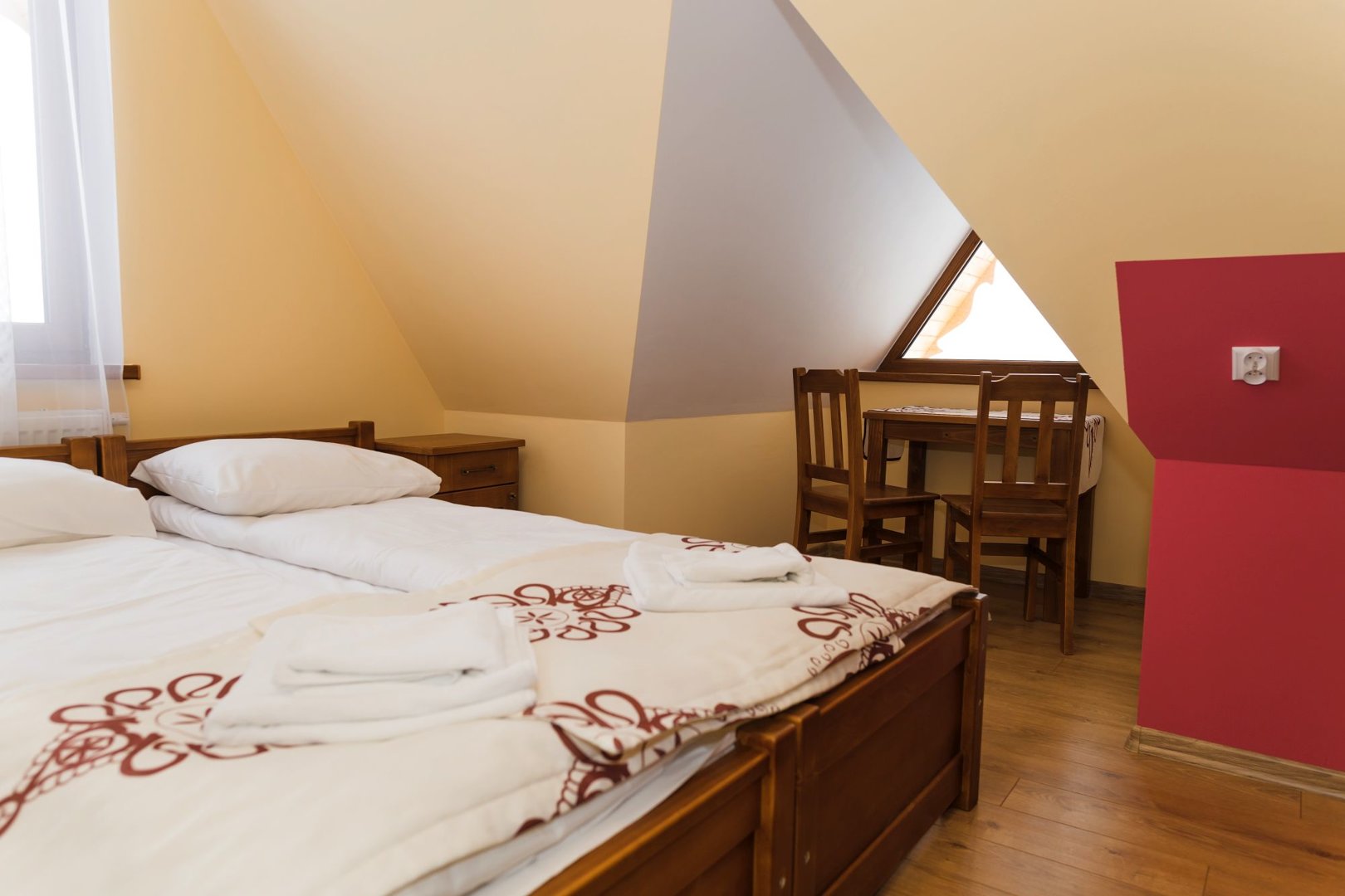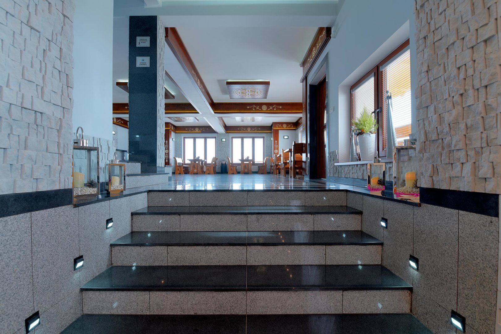 kavereiden kanssa. Iltaisin voit istua kahden hengen pöydän ääressä ja ihailla panoraamaikkunaa, jonka koko on 5x3 metriä. 6 metriä korkea, kolmion muotoinen huone, joka on sisustettu puulla ja tyylitelty