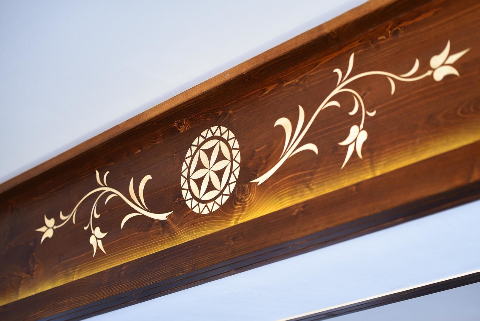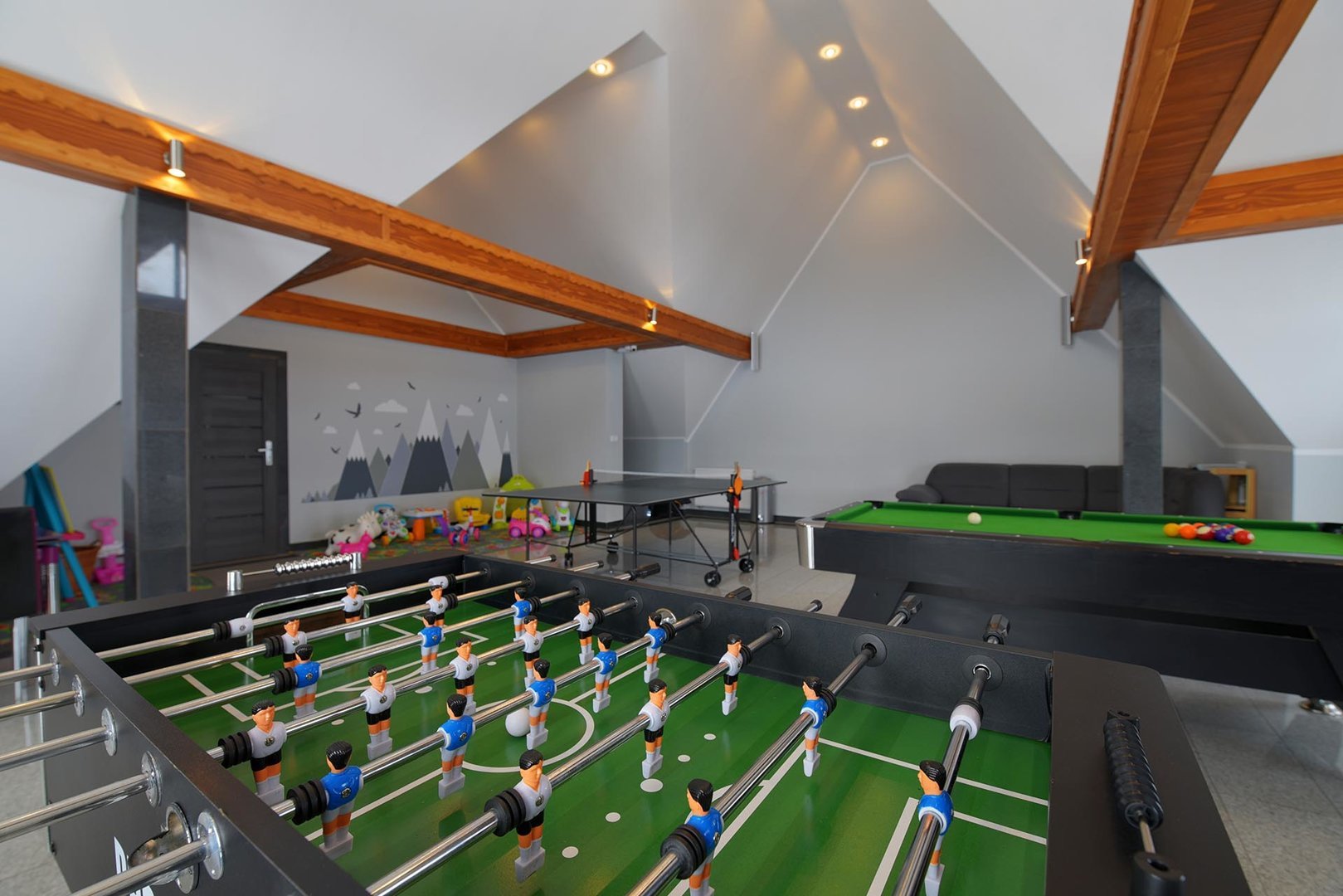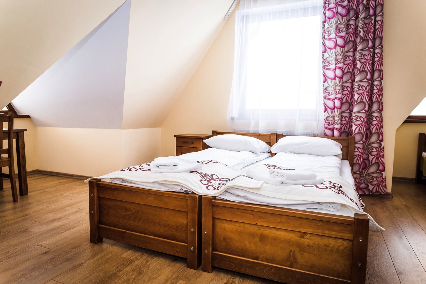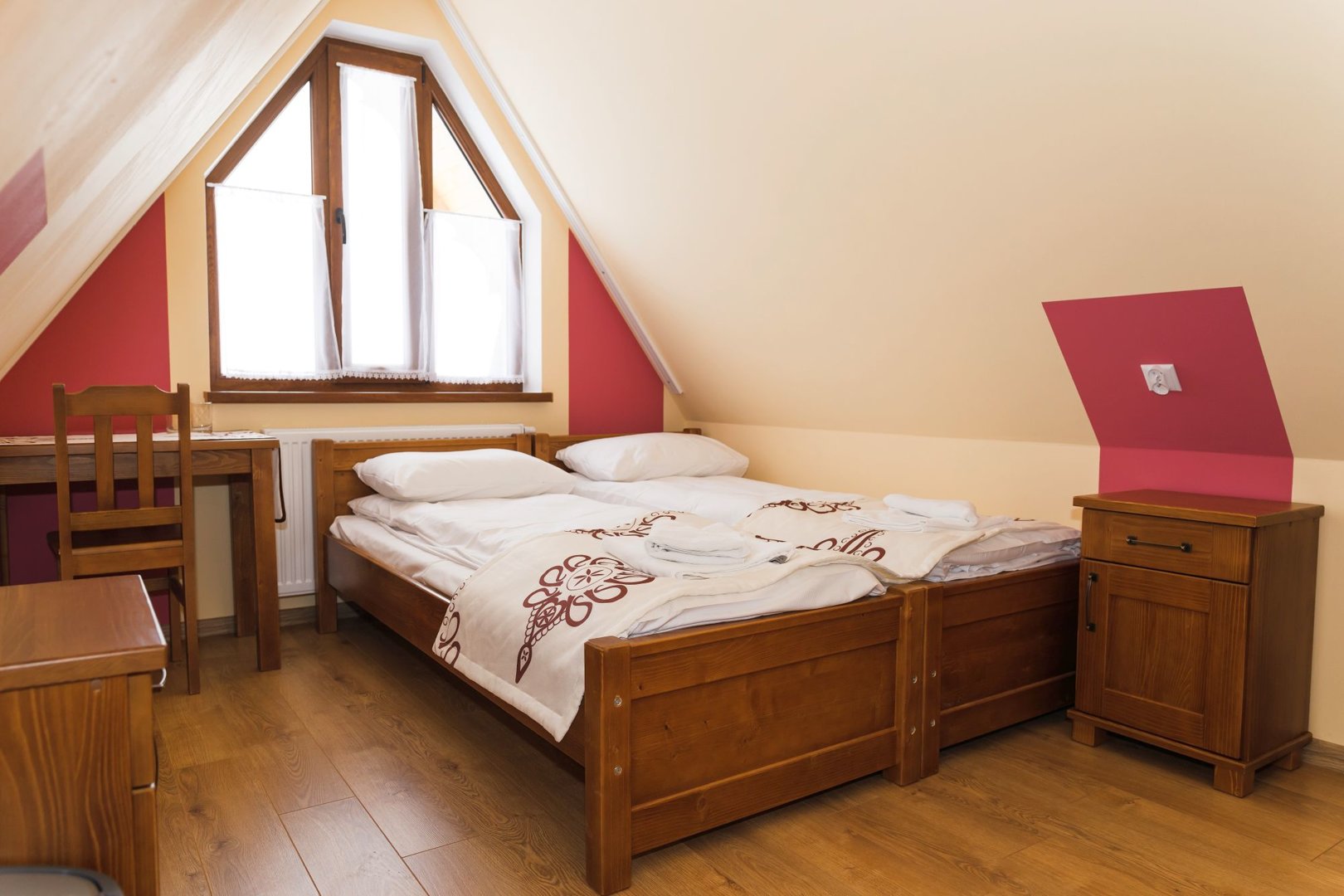 kavereiden kanssa. Iltaisin voit istua kahden hengen pöydän ääressä ja ihailla panoraamaikkunaa, jonka koko on 5x3 metriä. 6 metriä korkea, kolmion muotoinen huone, joka on sisustettu puulla ja tyylitelty